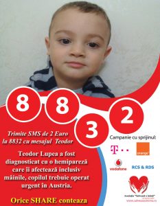 Viaţa lui Teodor Lupea, un băieţel de numai 3 ani şi 9 luni, depinde de 25.000 de Euro, bani pe care părinţii nu îi au. Copilul a fost diagnosticat cu o hemipareză, care îi afectează inclusiv mâinile, şi trebuie operat în regim de urgenţă, în Viena, la începutul lui februarie, altfel riscă să rămână paralizat pe viaţă.