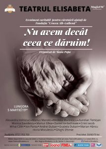 Alexandra Velniciuc, Marius Manole, Medeea Marinescu, Aurelian Temișan, Monica Davidescu, Marius Gilea, Daniel Iordachioaie, Cristi Iacob, Mihai Călin, Ion Parea, Andrei Duban, Grațiela Duban, Marian Hâncu și Horia Moculescu s-au alăturat Taniei Popa și vor evolua, luni, 5 martie, de la ora 19:00, pe scena Teatrului Elisabeta cu scopul de a strânge fonduri pentru vârstnicii aflați sub îngrijirile medicale ale Fundației Crucea Alb-Galbenă.