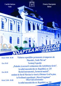 De mulți ani, și muzeul bârlădean participă la această frumoasă sărbătoare a științei și creației. Și în acest an publicul interesat va putea vizita expozițiile permanente din cele trei locații, dechise în acest moment. Este vorba de expozițiile de arheologie-istorie, artă – cu ultimele completări, ambele găzduite la sediul central, expozițiile dedicate sculptorului Marcel Guguianu, precum și expozițiile găzduite la sediul din str. Republicii nr. 235 (expozițiile de numismatică, personalități bârlădene și științele naturii). În această din urmă locație publicul va avea posibilitatea de a participa și la vernisarea expoziției temporare intitulată „Podoabe și accesorii vestimentare din Antichitatea târzie”. Acest eveniment va fi organizat, în colaborare cu muzeele din Iași, Botoșani, Tecuci și Galați, adunând la un loc piese extrem de frumoase și valoroase care vobesc de bunul gust și frumusețea obiectelor din perioada secolelor III – V d.Chr. Menționăm că expoziția va fi găzduită într-un spațiu recent renovat și dotat cu mobilier nou, vernisajul derulându-se începând cu ora 19.45.