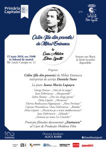 Primăria Municipiului București prin Casa Artelor “Dinu Lipatti” vă invită vineri, 15 iunie, de la orele 19.00, la recitalul de muzică clasică și poezie “Călin (file din poveste) la Casa Artelor <Dinu Lipatti> ”, pentru a marca 129 de ani de la trecerea în nemurire a poetului nostru național Mihai Eminescu, la 15 iunie 1889.