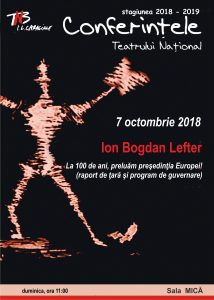 Duminică 7 octombrie 2018, de la ora 11.00, la Sala Mică, în cadrul programului CONFERINŢELE TEATRULUI NAŢIONAL, Ion Bogdan Lefter,  prezintă conferinţa cu tema ”La 100 de ani, preluăm preşedinţia Europei! (raport de ţară şi program de guvernare)”.
