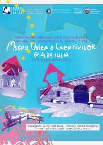 „Marea unire a creativilor@Alba Iulia” este un proiect în premieră națională, special creat pentru a marca aniversarea Centenarului la Alba Iulia și pentru a poziționa orașul pe harta centrelor culturale inovative la nivel european. Proiectul se va desfășura în perioada 5 – 11 noiembrie 2018 și va avea trei secțiuni complementare: 1. o conferință internațională pe tema dezvoltării comunitare prin cultură la care sunt așteptați reprezentați din mai multe țări europene, printre care Italia, Estonia, Portugalia, Suedia, Serbia și din România; 2. o serie de 5 workshop-uri adresate tinerilor care se va încheia cu organizarea unui festival de două zile realizat integral de tineri; 3. o expoziție de panouri interactive.