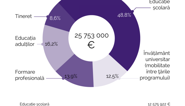 Pentru proiectele de mobilitate bugetul aprobat pentru 2018 este de peste 56 de milioane de euro, domeniul de învățământ universitar beneficiind de cel mai generos buget, aproape 35 de milioane de euro. Pentru proiectele de parteneriate strategice, bugetul aprobat se ridică la aproape 25 de milioane euro, cu accent pe educația școlară.