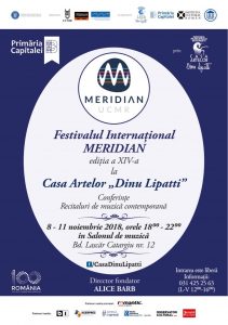 Primăria Municipiului București prin Casa Artelor „Dinu Lipatti” vă invită la cea de-a XIV-a ediție a Festivalului Internațional MERIDIAN. În calitate de co-producător, Casa Artelor „Dinu Lipatti” va organiza în perioada 8-11 noiembrie 2018, în Salonul de muzică, de la orele 18, patru seri dedicate muzicii noi.