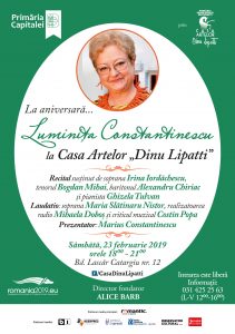 Primăria Municipiului București prin Casa Artelor „Dinu Lipatti” vă invită sâmbătă, 23 februarie 2019, de la orele 18.00, să ne fiți alături La aniversară… Luminița Constantinescu, la Casa Artelor “Dinu Lipatti”.