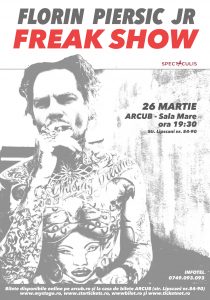 După o pauză de aproape șase luni, Florin Piersic Jr. își dă întâlnire cu publicul bucureștean marți, 26 martie, începând cu ora 19:30, la Sala Mare – ARCUB, pentru o adevărată demonstrație de talent actoricesc și regizoral în spectacolul „Freak Show”.