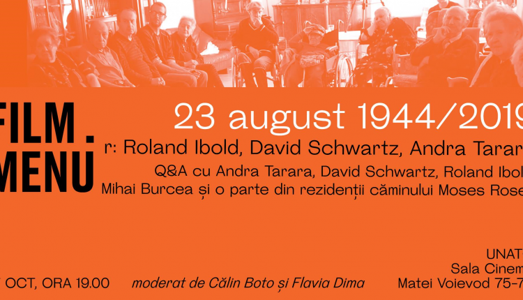 Varianta finală a documentarului „23 august 1944/2019” (r. Andra Tarara, David Schwartz, Roland Ibold) va fi proiectată în premieră vineri, 17 octombrie 2019, de la ora 19:00, în Sala Cinema de la UNATC (Str. Matei Voievod, Nr. 75-77, Corpul C), în cadrul Cineclubului Film Menu. Intrarea este liberă!