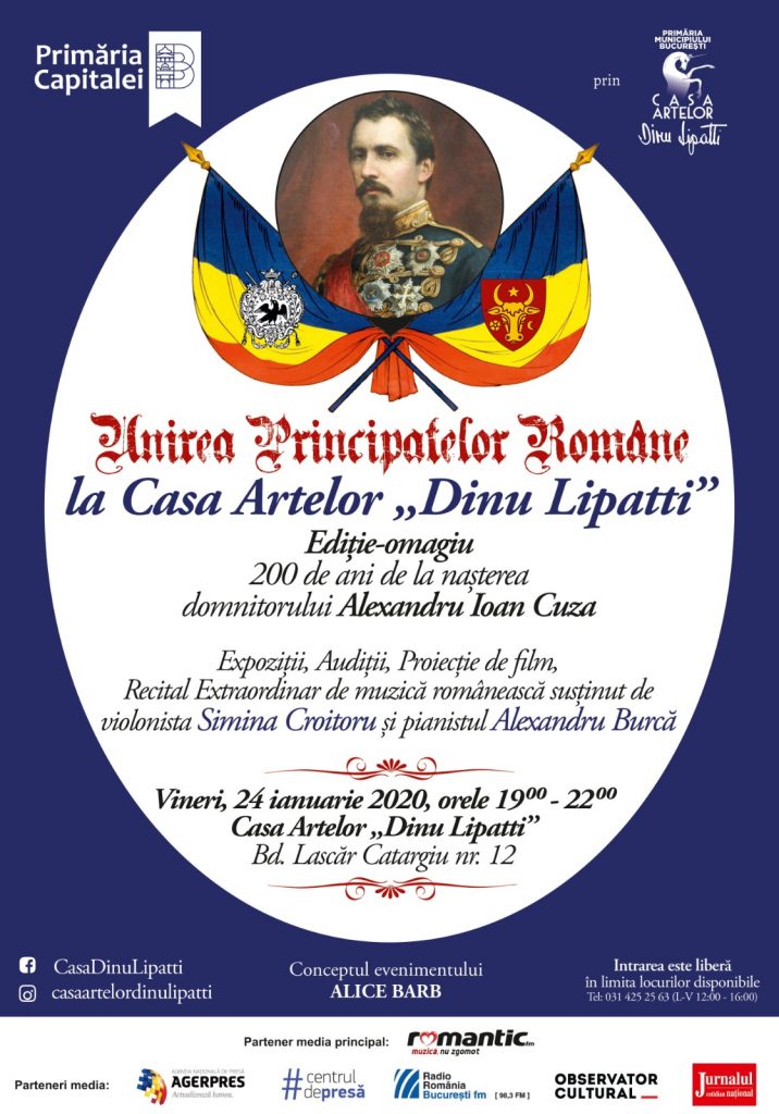 Primăria Municipiului Bucureşti, prin Casa Artelor „Dinu Lipatti”, vă invită în data de 24 ianuarie 2020, între orele 19:00-22:00, să sărbătorim Unirea Principatelor Române realizată sub conducerea domnitorului Alexandru Ioan Cuza, de la a cărui naștere se împlinesc 200 de ani. Cel care avea să devină „Domnul Unirii” de la 1859 s-a născut pe data de 20 martie 1820, la Bârlad, în Moldova. Unirea Principatelor Române este considerată prima etapă în crearea statului unitar român modern.