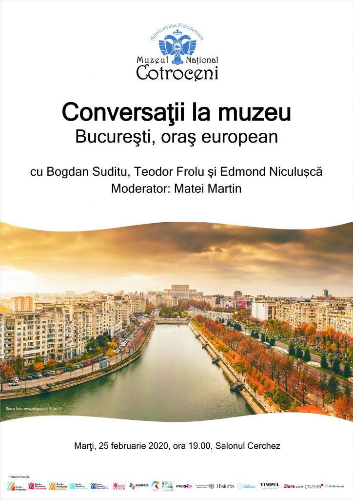 Muzeul Național Cotroceni organizează marți, 25 februarie, ora 19.00, conferința „București, oraș european”, susținută de Teodor Frolu, Edmond Niculușcă, Bogdan Suditu și moderată de Matei Martin.