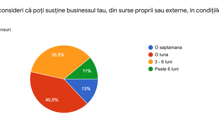 40% dintre companii consideră că își vor putea susține activitatea maxim o lună din surse proprii, iar 35% dintre ele cred că pot rezista între 3 și 6 luni în condițiile actuale.