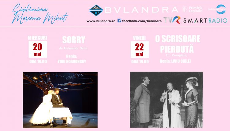 De asemenea, așa cum i-a obișnuit pe spectatorii săi de pretutindeni, Teatrul Municipal „Lucia Sturdza Bulandra” va continua difuzarea spectacolelor online, pe pagina oficială de facebook și pe site-urile www.bulandra.ro, www.smartradio.ro și va transmite, în zilele de 20 și 22 mai 2020, la ora 19.00, spectacolul Sorry de Aleksandr Galin, regia: Yuri Kordonsky (2004) respectiv, O scrisoare pierdută de I.L. Caragiale, regia Liviu Ciulei (1979), două dintre producțiile de succes în care a jucat Mariana Mihuț.