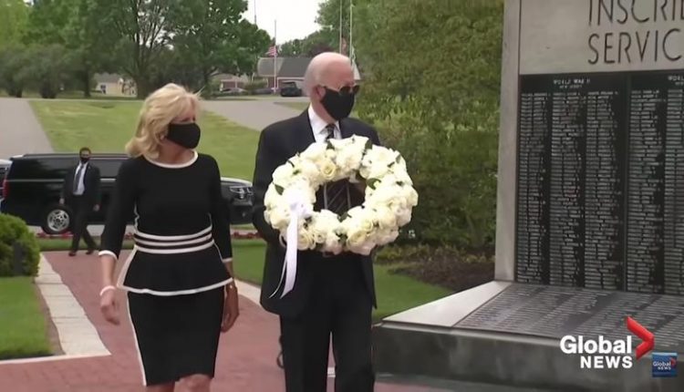 Joe Biden, 77 de ani, a ales „Memorial Day”, ziua de omagiere a soldaţilor americani căzuţi în luptă, pentru a-şi face prima apariţie în public de la 15 martie. El şi soţia sa, Jill, au purtat măşti negre pentru a depune o coroană de flori la monumentul eroilor din statul său, Delaware, luni.