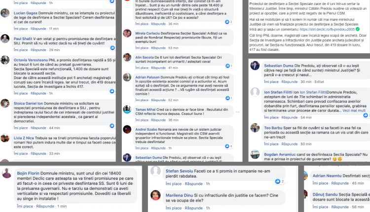 Comunitatea Declic a organizat, joi, un altfel de protest, în online: peste 300 de membri i-au scris, simultan, ministrului Cătălin Predoiu mesaje pe pagina de Facebook și i-au cerut să desființeze urgent Secția Specială.