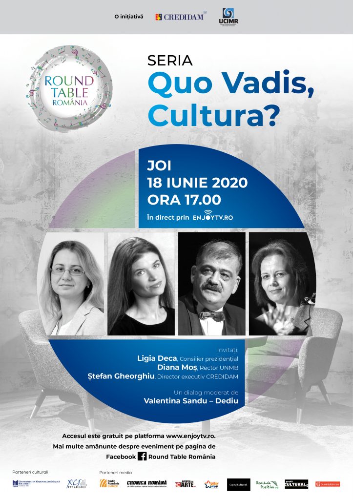 Următoarele ediții vor avea loc în fiecare joi, de la ora 17:00, pe EnjoyTV.ro. Round Table România seria „Quo Vadis Cultura?” este o inițiativă CREDIDAM – Centrul Român pentru Administrarea Drepturilor Artiștilor Interpreți și UCIMR – Uniunea de Creație Interpretativă a Muzicienilor din România. Parteneri culturali: Universitatea Națională de Muzică din București, Exces Music. Parteneri media: EnjoyTV Romania, Radio Romania Cultural, Cronica Română, Agenția de Carte, Zile și Nopți, Capital Cultural, România Pozitivă, Profil Cultural, Bucureșteni.ro