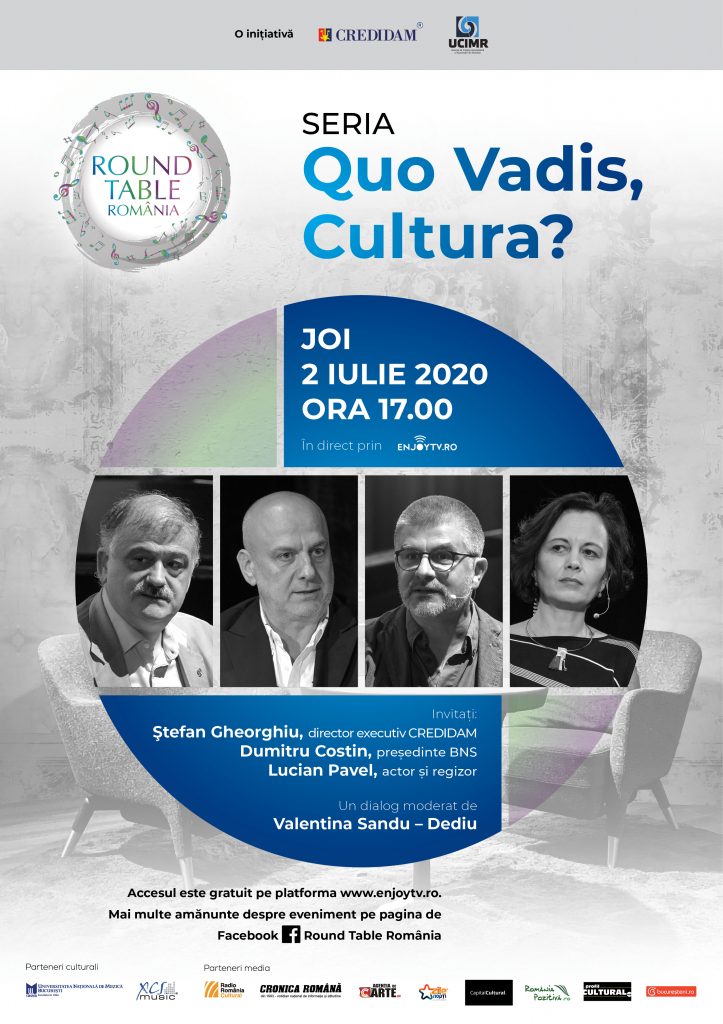Round Table România seria „Quo Vadis Cultura?” este o inițiativă CREDIDAM – Centrul Român pentru Administrarea Drepturilor Artiștilor Interpreți și UCIMR – Uniunea de Creație Interpretativă a Muzicienilor din România. Parteneri culturali: Universitatea Națională de Muzică din București, Exces Music. Parteneri media: EnjoyTV Romania, Radio Romania Cultural, Cronica Română, Agenția de Carte, Zile și Nopți, Capital Cultural, România Pozitivă, Profil Cultural, Bucureșteni.ro