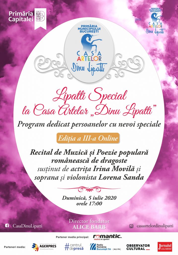Primăria Municipiului Bucureşti, prin Casa Artelor „Dinu Lipatti”, vă invită duminică 5 iulie 2020, la orele 17:00, la Programul socio-cultural dedicat persoanelor cu nevoi speciale, „Lipatti Special” – Ediție Online.