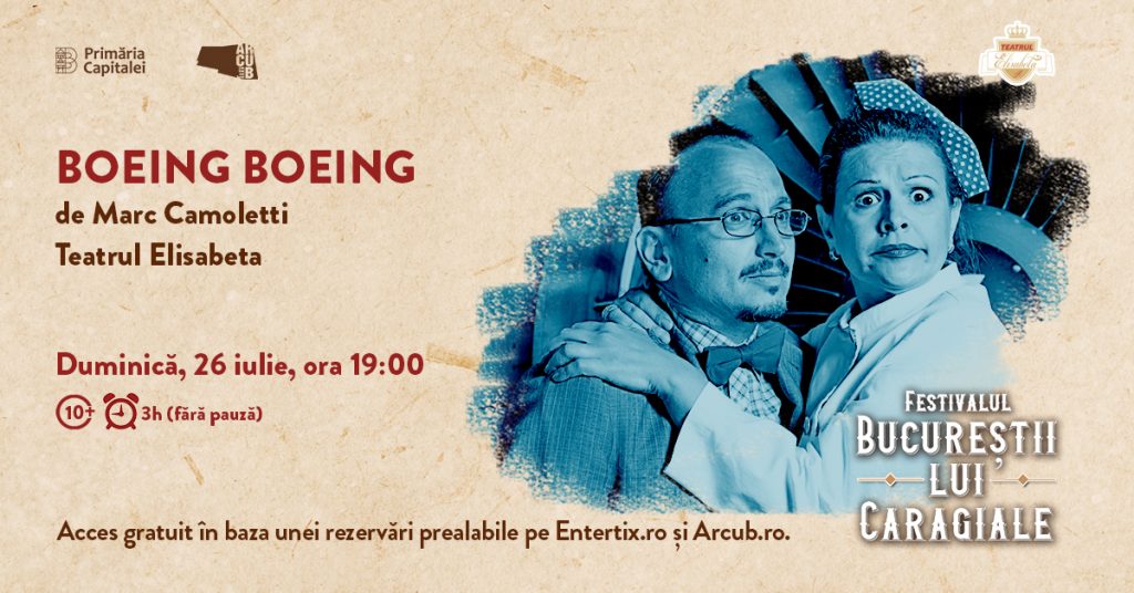 Spectacolul de duminică seară 26 iulie, începe de la ora 19.00 şi este una dintre cele mai jucate comedii ale Teatrului Elisabeta, „Boeing Boeing”. Scrisă de dramaturgul francez Marc Camoletti, spectacolul de teatru „Boeing Boeing” a intrat în The Guiness Book of Records ca piesa de teatru francofonă cu cele mai multe puneri în scenă în întreaga lume. Montarea de la Bucureşti este regizată de Şerban Puiu şi îi are în distribuţie pe actorii Andreas Petrescu, Marius Gîlea, Anca Sigartău, Anca Dinicu, Alexandra Velniciuc, Tania Popa, Iulian Bălan.