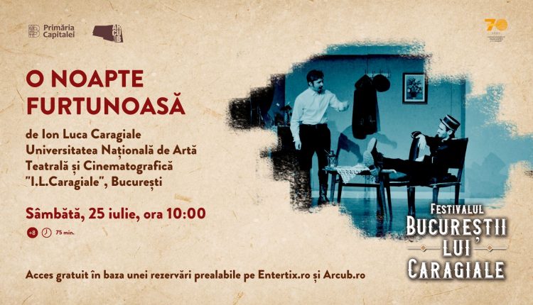 Al doilea weekend de festival începe sâmbătă, 25 iulie, ora 10.00, cu un spectacol de matineu excelent jucat al actorilor de la Universitatea Naţională de Artă Teatrală şi Cinematografică „I.L. Caragiale”, după piesa „O noapte furtunoasă”, în regia Teodorei Florea. Un spectacol potrivit atât pentru cei mari, cât şi pentru copiii de şcoală generală, producţia „O noapte furtunoasă” a UNATC aduce un suflu extrem de proaspăt textului lui Caragiale printr-un ritm alert, replici spumoase şi personaje haioase jucate de actorii Alexandra Sârbei, Azaleea Necula, Gabriel Hrițcu, Aurelian Culea, Dima Țui, Andrei Barbu, Alexandru Horghidan.
