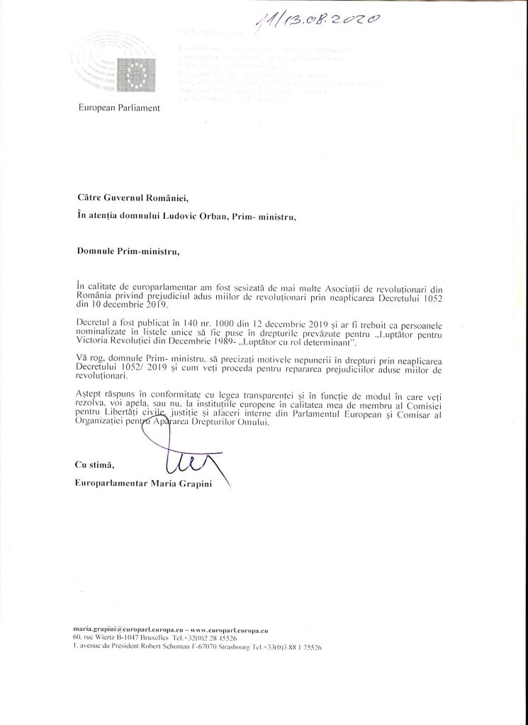 În contextul în care a fost sesizată de mai multe Asociații de revoluționari din România, privind prejudiciul adus milioanelor de revoluționari prin neaplicarea Decretului 1052 din 10 decembrie 2019, europarlamentarul Maria Grapini a reacționat ferm, trimițând în acest sens o adresă premierului Orban.