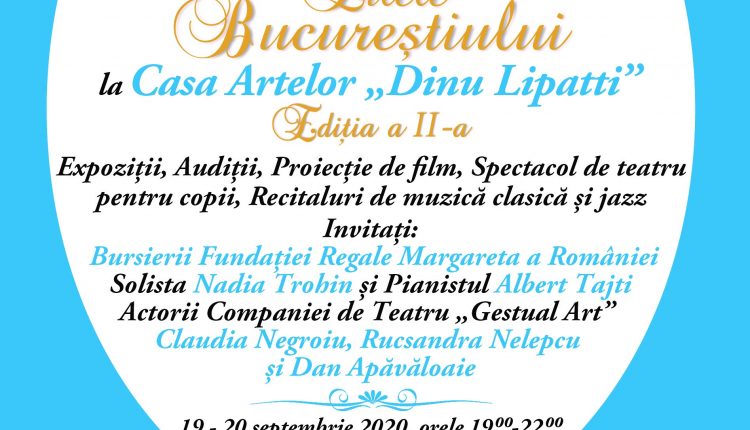 Primăria Municipiului București prin Casa Artelor „Dinu Lipatti” vă invită sâmbătă și duminică, 19 – 20 septembrie 2020, între orele 19:00-22:00, la cea de-a doua Ediție a „Zilelor Bucureștiului” la Casa Artelor „Dinu Lipatti”, Eveniment ce se va desfășura în aer liber, în Curtea cu balansoare.
