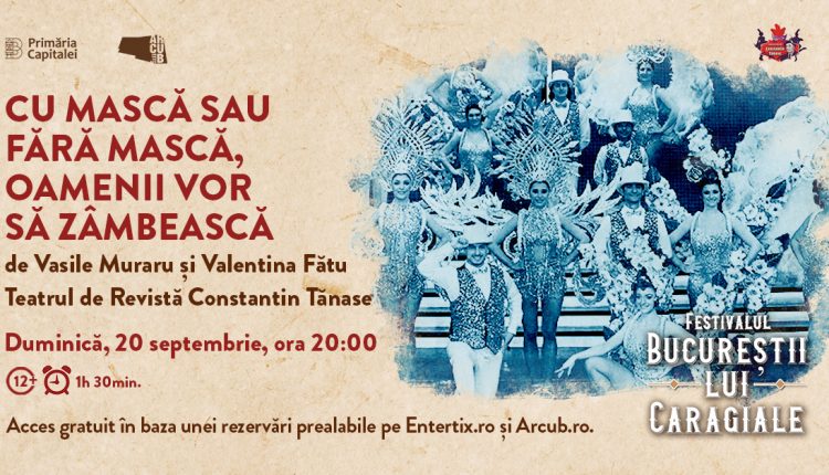 Ediţia din acest an „Bucureştii lui Caragiale” se încheie cu reprezentaţia celui mai nou spectacol din repertoriul Teatrului de Revistă „Constantin Tănase”. Spectacolul „Cu mască sau fără mască, oamenii vor să zâmbească” este programat duminică, 20 septembrie, de la ora 20.00. Combinând satira socială cu muzica, coregrafia şi cu o scenografie spectaculoasă, premiera stagiunii estivale 2020 a Teatrului de Revistă din Bucureşti este inspirat de cele mai recente schimbări survenite la nivelul societăţii. Realizat de Vasile Muraru și Valentina Fătu, „Cu mască sau fără mască, oamenii vor să zâmbească” este un spectacol de revistă plin de culoare și savoare, cu umor, recitaluri de muzică ușoară și momente de dans. Din distribuţia spectacolului fac parte actorii Alexandru Arşinel, Vasile Muraru, Valentina Fătu, Nae Alexandru, Cristian Simion, soliştii Bianca Sârbu, Daniela Cristea, Alin Gheorghişan şi, nu în ultimul rând, Baletul Teatrului de Revistă „Constantin Tănase”.