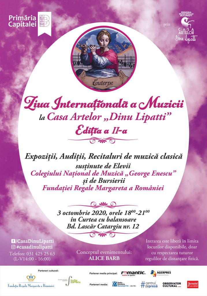 Primăria Municipiului București prin Casa Artelor „Dinu Lipatti” vă invită sâmbătă 3 octombrie 2020, între orele 18:00-21:00, la cea de-a doua Ediție a „Zilei Internaționale a Muzicii” la Casa Artelor „Dinu Lipatti”, eveniment ce se va desfășura în aer liber, în Curtea cu balansoare.
