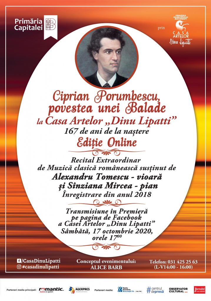 Sâmbătă, 17 octombrie 2020, de la orele 17:00 vă invităm să urmăriți Transmisiunea în Premieră pe pagina noastră de Facebook a Recitalului Extraordinar de muzică clasică românească susținut de violonistul Alexandru Tomescu, care interpretează la celebra Vioara Stradivarius Elder-Voicu, și de pianista Sînziana Mircea, intitulat „Ciprian Porumbescu, povestea unei balade”. Evenimentul a avut loc în anul 2018 în Salonul de Muzică al Casei Artelor „Dinu Lipatti”, iar în programul celor doi artiști au fost incluse „Balada” lui Ciprian Porumbescu, lucrări de George Enescu, Dinu Lipatti și Vasile Filip.