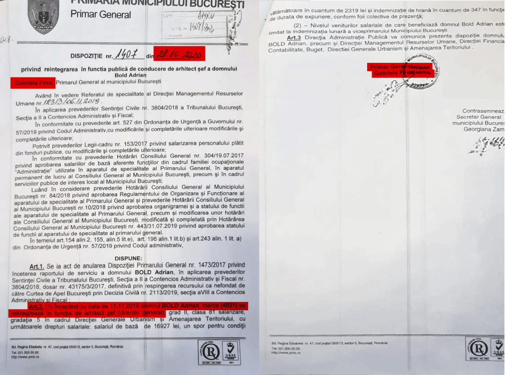 Aveți, mai jos, cine a semnat pentru reintegrarea lui Adrian Bold în funcția de arhitect-șef, pe 28.10.2020, deci cu o zi înainte de a prelua eu mandatul – chiar doamna ex-primar.