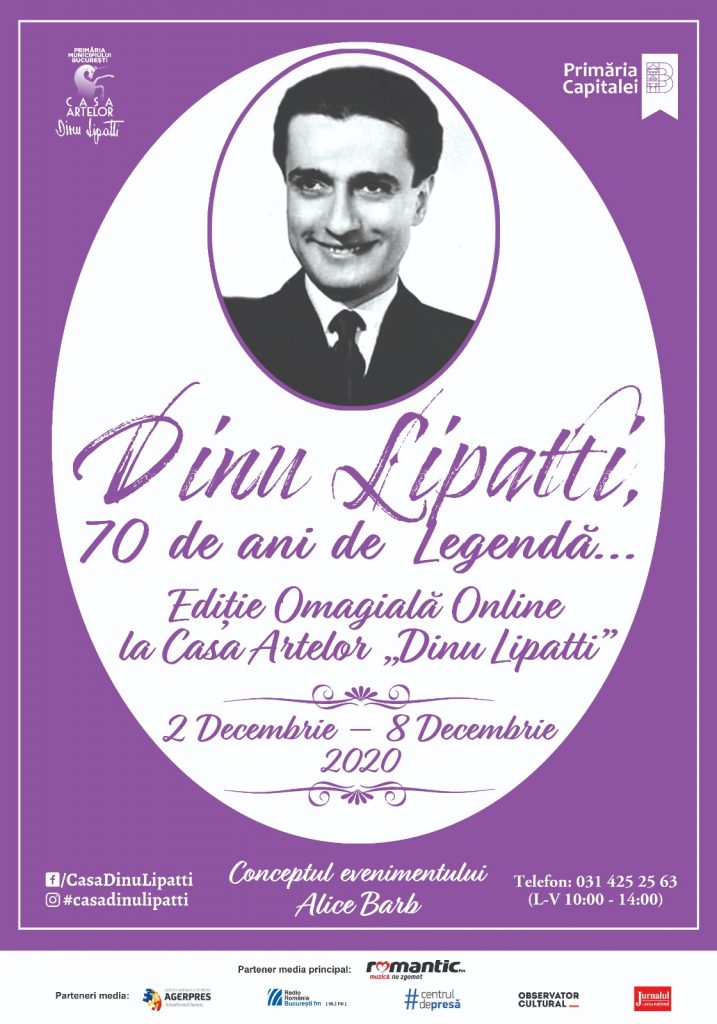Casa Artelor „Dinu Lipatti” deschide astăzi, 2 decembrie 2020, la orele 09:00, seria de 7 Zile de Evenimente reunite sub titlul „Dinu Lipatti, 70 de ani de Legendă”, o Ediție Omagială Online care marchează 70 de ani de la trecerea în eternitate a celui mai mare pianist român al tuturor timpurilor, compozitor și pedagog de geniu, Dinu Lipatti (n.19 martie 1917 București – d. 2 decembrie 1950 Geneva).