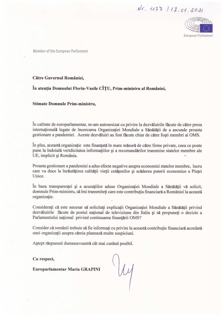 „Considerați că este necesar să solicitați explicații Organizației Mondiale a Sănătății privind dezvăluirile făcute de postul național de televiziune din Italia și să propuneți o decizie a Parlamentului național privind continuarea finanțării OMS?”, se mai arată în scrisoarea deschisă adresată de europarlamentarul Grapini, premierului Cîțu.