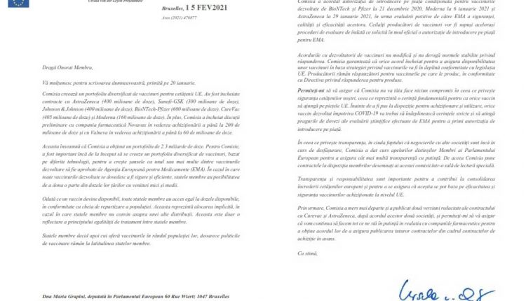 Transparența și responsabilitatea sunt importante pentru a contribui la consolidarea încrederii cetățenilor europeni și pentru a se asigura că aceștia se pot baza pe eficacitatea și siguranța vaccinurilor achiziționate la nivelul UE ”, a mai menționat, în răspunsul său, președintele Comisiei Europene.