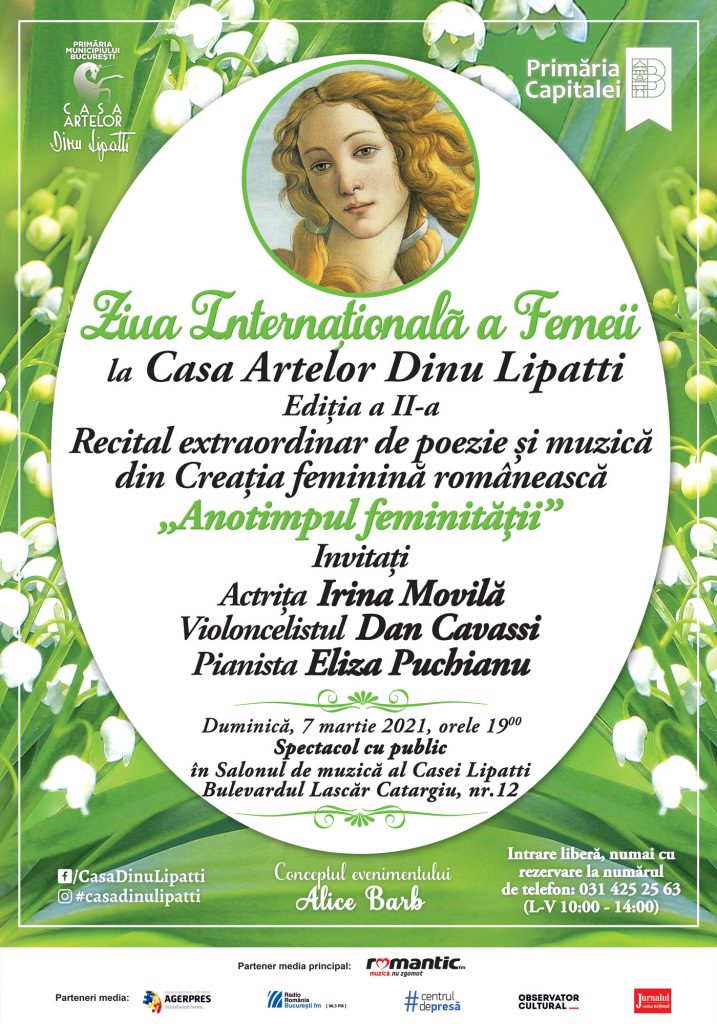 Casa Artelor Dinu Lipatti vă invită în Salonul de muzică duminică, 7 martie 2021, de la orele 19:00, să celebrăm împreună Ziua Internațională a Femeii cu Recitalul Extraordinar de poezie și muzică din creația feminină românească – „Anotimpul feminității” –  susținut de actrița Irina Movilă, violoncelistul Dan Cavassi și pianista Eliza Puchianu, o producție realizată în Premieră absolută de Casa Lipatti special pentru acest Eveniment.