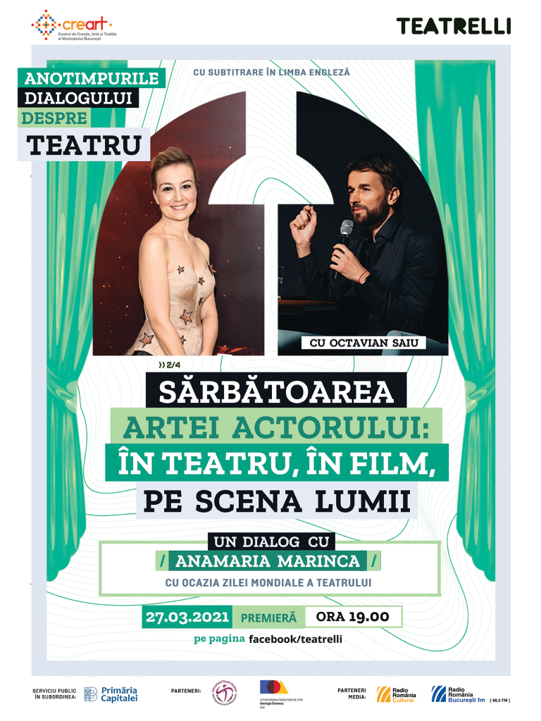 O ediție de neratat a Anotimpurilor dialogului despre teatru propune criticul de teatru Octavian Saiu: o întâlnire de vis despre primăvara teatrului, un dialog despre arta actorului atât în teatru, cât și în film, dar și pe scena lumii, cu una dintre cele mai apreciate actrițe de origine română în plan național și internațional. Anamaria Marinca este invitata evenimentului organizat și transmis de creart/Teatrelli, difuzat în mod simbolic chiar de Ziua Mondială a Teatrului.