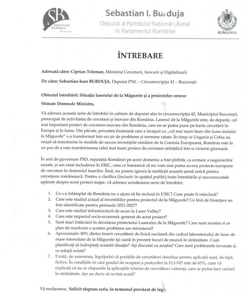 Deputatul PNL, Sebastian Burduja, i-a trimis ministrului Cercetarii, Inovarii și Digitalizării, Ciprian Teleman, o serie de întrebări pe marginea subiectului „Laserul de la Măgurele”. Deputatul liberal dorește, în acest mod, să clarifice toate întrebările și necunoscutele despre acest proiect major.