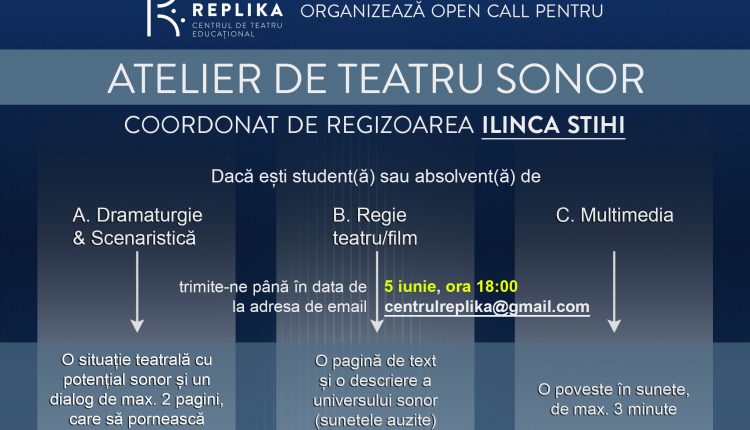 Centrul de Teatru Educațional Replika lansează înscrierile pentru un atelier de spectacol sonor, care va avea loc în perioada 29 iunie-4 iulie și va fi coordonat de regizoarea Ilinca Stihi.