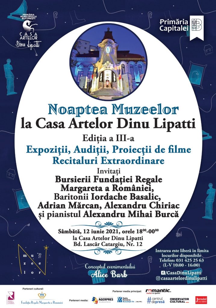 Casa Artelor Dinu Lipatti vă invită sâmbătă, 12 iunie 2021, între orele 18:00 și 00:00, să descoperiți și să redescoperiți Casa în care a locuit pianistul și compozitorul Dinu Lipatti împreună cu familia sa și să vă bucurați de magia muzicii, la cea de-a III-a Ediție a Evenimentului „Noaptea Muzeelor”.