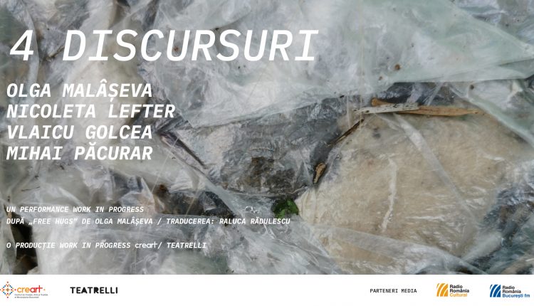 Performance-ul work in progress „4 Discursuri” – Olga Malâșeva, Nicoleta Lefter, Vlaicu Golcea și Mihai Păcurar – face parte din seria de spectacole experimentale inițiată de creart /Teatrelli, fiind al treilea din acest an, după „INT. EXT” și „Băiatul văduvă”. Instalația-performance intră în intimitatea provocărilor aduse de pandemieși cu precădere de perioada carantinei. Reprezentațiile din 17 și 18 iulieaduc publicului spre vizionare prima etapa de lucru a spectacolului.