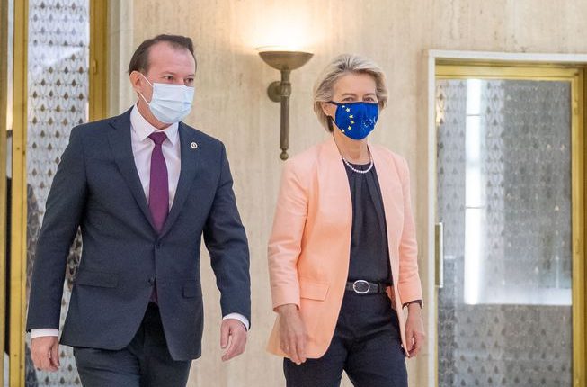 Președintele Comisiei Europene, Ursula von der Leyen, a susținut România în procesul de aprobare a PNRR, a transmis Florin Cîțu, luni, într-o conferință de presă alături de Klaus Iohannis și Ursula von der Leyen.