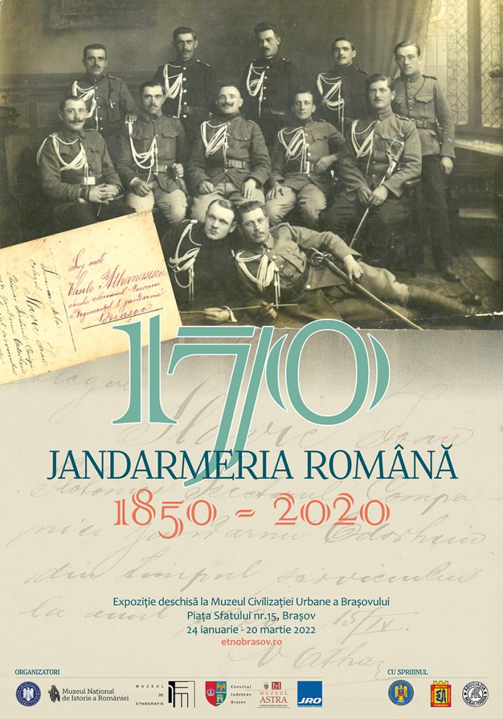 Muzeul Național de Istorie a României, în parteneriat cu Inspectoratul General al Jandarmeriei Române și Consiliul Județean Brașov, prin Muzeul de Etnografie Brașov, anunță deschiderea expoziției itinerante „Jandarmeria Română 1850 – 2020” la sediul Muzeului Civilizației Urbane a Brașovului, situat în Piața Sfatului, nr. 15. Vernisajul va avea loc luni, 24 ianuarie 2022, la ora 12.00.