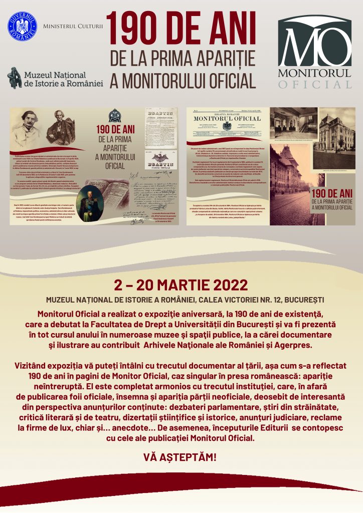 Expoziția este realizată cu ocazia aniversării a 190 de ani de existență a „Monitorului Oficial”, publicaţie oficială a statului român, al cărei prim număr a apărut în anul 1832. Publicația reprezintă un caz singular în presa românească, având o apariție neîntreruptă. „Monitorul Oficial” a devenit, încă de la înfiinţare, un adevărat breviar al principalelor evenimente istorice, politice şi culturale care au dus la apariţia şi evoluţia României moderne.
