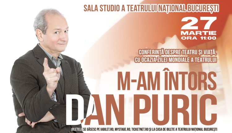 Cunoscutul actor, regizor şi eseist Dan Puric marchează Ziua Mondială a Teatrului oferind publicului o reprezentație specială a celui mai nou spectacol-conferință, intitulat „M-am întors”, ce va avea loc duminică, 27 martie, la Sala Studio a Teatrului Național București, de la ora 11.00.