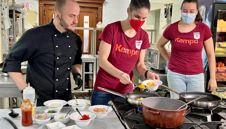 Lidere în campionatul național de handbal, Ainhoa Hernandez, Alicia Fernández și antrenorul secund David Ginesta s-au „antrenat” pentru Ziua internațională a preparatului spaniol paella gătind … paella.