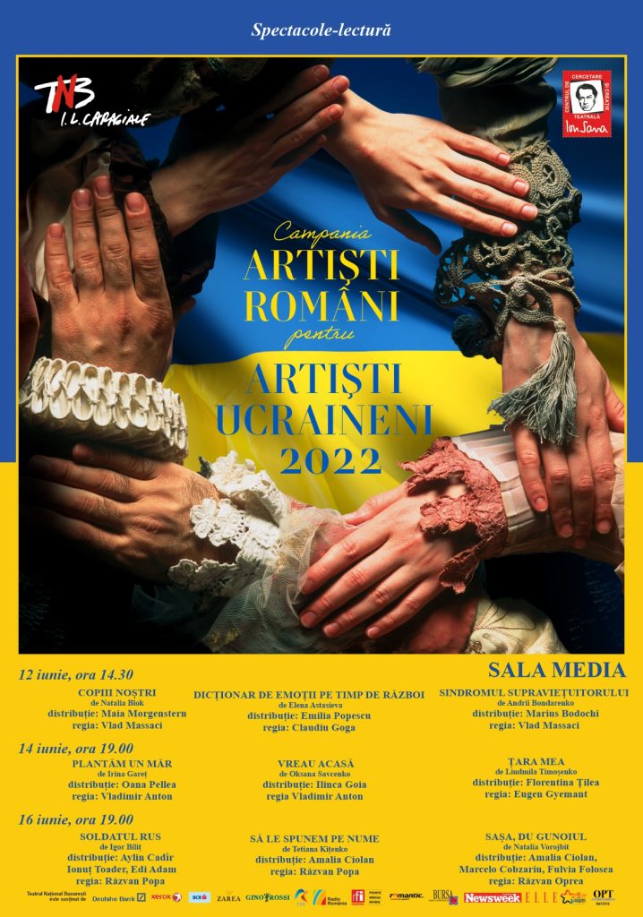 Astfel, în zilele de 12, 14 și 16 iunie, la Sala Media TNB, vor avea loc o serie de spectacole-lectură, pe baza unor texte scrise de autori ucraineni, după declanșarea războiului din Ucraina, în traducerea Ralucăi Rădulescu. Încasările provenite din vânzarea de bilete vor fi colectate de UNITER și virate în contul Uniunii Naționale a Artiștilor de Teatru din Ucraina (Contul Solidarității Teatrale: