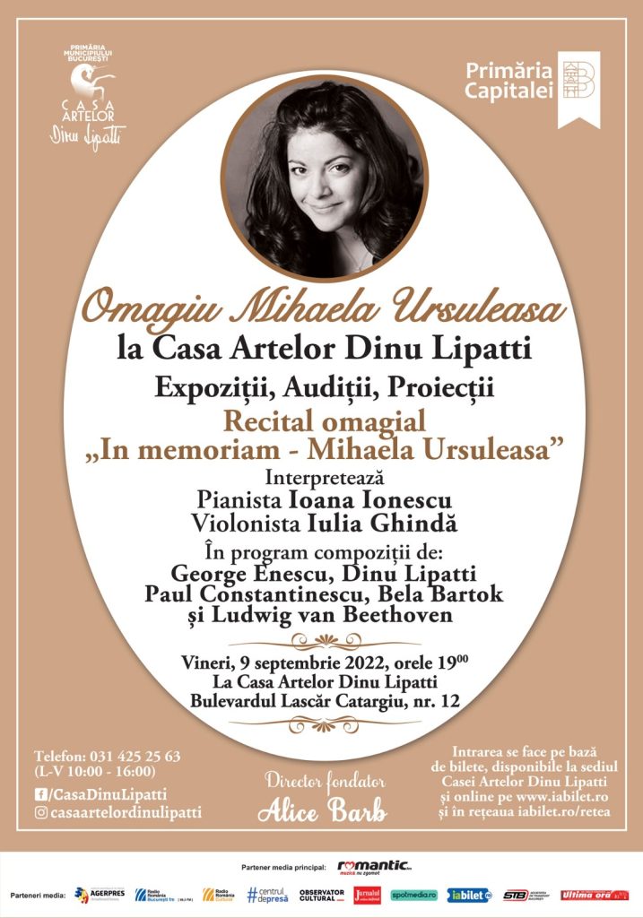 Publicul este așteptat vineri, 09 septembrie 2022, de la orele 19:00 în Salonul de Muzică al Casei Lipatti, unde va avea loc Proiecția unor interviuri și filme dedicate regretatei pianiste, urmată de Recitalul „In memoriam – Mihaela Ursuleasa” susținut de pianista Ioana Ionescu și violonista Iulia Ghindă. Vor fi interpretate piese ale compozitorilor Bela Bartok, Ludwig van Beethoven, Paul Constantinescu, Dinu Lipatti și George Enescu.