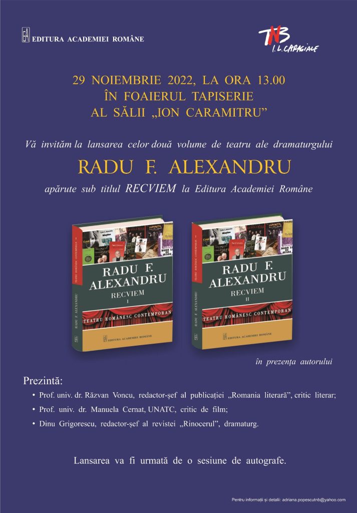 Încununând, firesc, această prodigioasă carieră, apare acum, sub titlul RECVIEM, cea mai amplă culegere de piese semnate de Radu F. Alexandru, reunind, în 2 volume și 1358 de pagini, 22 de piese care reprezintă, așa cum o spune autorul „…întregul meu parcurs în lumea fascinantă a teatrului”. Volumele sunt editate într-o formă grafică de excepție de către prestigioasa Editură a Academiei.