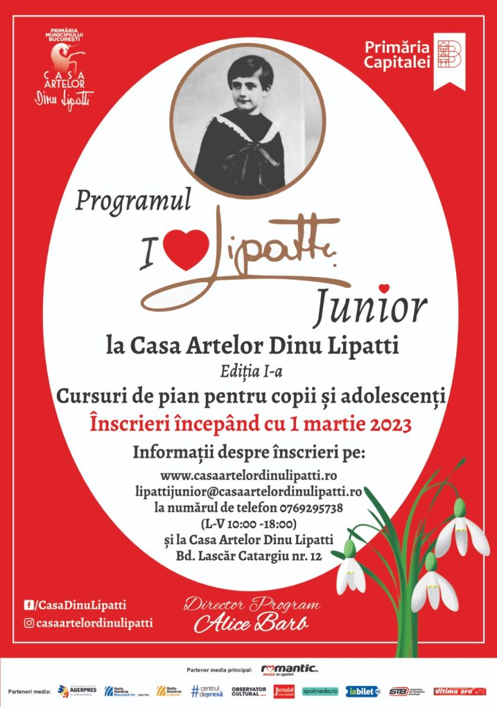 Centrul Cultural “Casa Artelor Dinu Lipatti” lansează la 1 Martie 2023, de Mărțișor, un nou Program educațional intitulat “I Love Lipatti – Junior”, dedicat copiilor, adolescenților și tinerilor care iubesc muzica clasică și doresc să studieze pianul în Saloanele Casei Lipatti. Programul este o prelungire a Festivalului “I Love Lipatti” și fost creat de regizoarea Alice Barb din dorința de a oferi unei noi generații șansa de a studia pianul clasic chiar în Casa legendarului muzician Dinu Lipatti, chiar în casa în care a trait și a creat, care a fost și un extraordinar profesor la Conservatorul din Geneva, unde a format tineri pianiști valoroși.