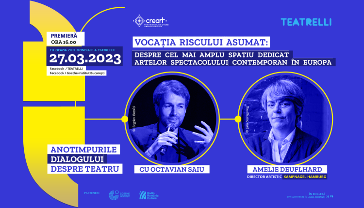 Pe 27 martie, de Ziua Mondială a Teatrului, creart/Teatrelli aduce publicului larg, precum şi profesioniştilor din lumea artistică un dialog-eveniment despre vocaţia rară de a crede în teatru până la capăt, „fără compromisuri”. Invitata lui Octavian Saiu este Amelie Deuflhard, directoarea artistică a Kampnagel (Hamburg) – cel mai amplu spațiu de producție la nivel european dedicat artelor spectacolului contemporan, conceput pentru sectorul independent.