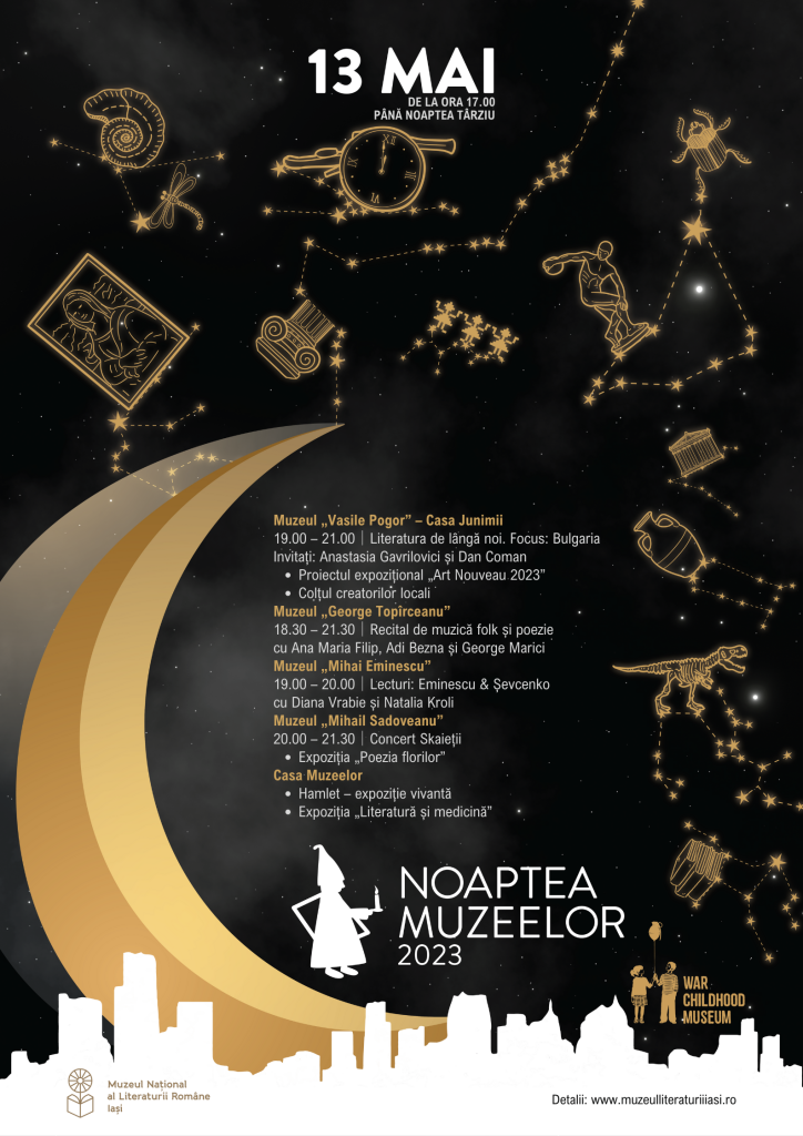 Sâmbătă, 13 mai 2023, Muzeul Național al Literaturii Române Iași va deschide 14 muzee din rețeaua sa în cadrul evenimentului Noaptea Europeană a Muzeelor.