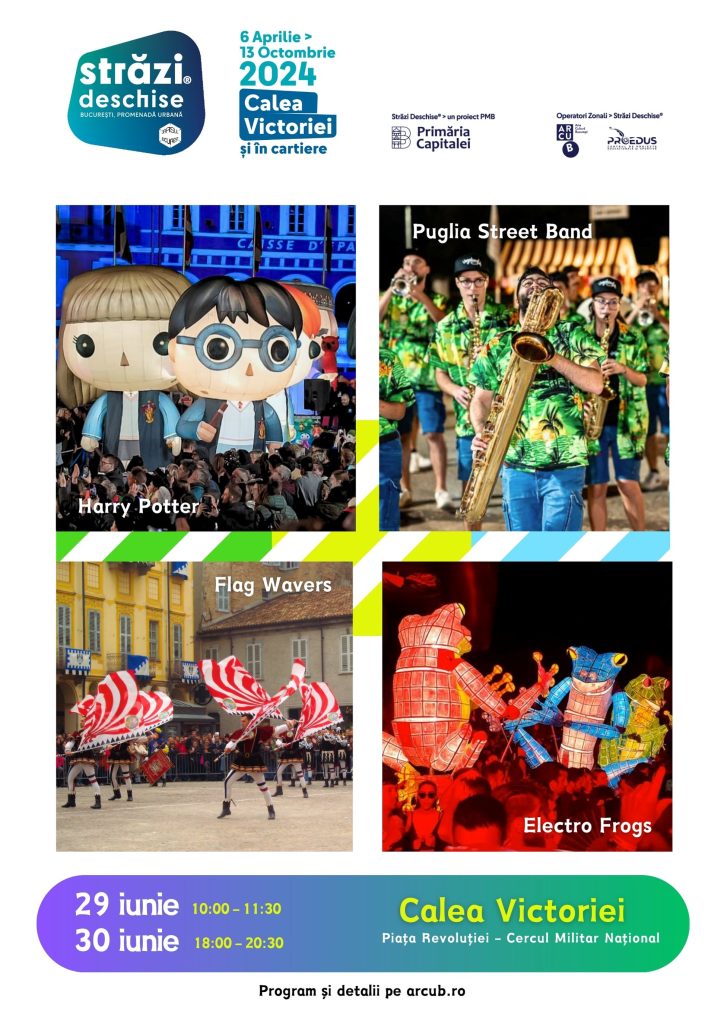 Personajele fantastice de mari dimensiuni din celebra serie Harry Potter din Spania, giganticele broaște luminoase Electro Frogs din Franța, grupul de stegari Flag Wavers și trupa Puglia Street Band din Italia se întâlnesc cu publicul bucureștean pentru a anima Calea Victoriei, pe segmentul traseului pietonal dintre Piața Revoluției și Cercul Militar Național. Fiecare trupă va susține câte 5 reprezentații de aproximativ 30 de minute, atât sâmbătă, 29 iunie, cât și duminică, 30 iunie.
