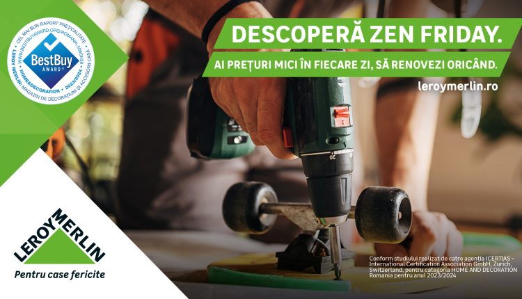 Leroy Merlin, retailer specializat în construcții, decorațiuni și grădinărit, continuă și în acest an campania „Zen Friday”, prin care dorește să transmită consumatorilor că, în ciuda perioadei pline de promoții, compania oferă o politică de prețuri mici în fiecare zi, indiferent de lună sau anotimp. Astfel, clienții se pot bucura oricând de o ofertă diversificată, cu peste 40.000 de produse, pentru toate proiectele de renovare și amenajare.